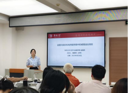 在讲座中,戴老师围绕“问询函监管威慑溢出”这一核心议题,以清晰严谨的逻辑框架系统阐述了其研究。首先明确研究的制度背景,进而提出研究假设,并详细说明实证设计思路与对应结果;在实证基础上深入分析,得出关键结论:机构持股网络是问询函监管威慑溢出的关键渠道。研究进一步阐明,机构持股网络的结构特征及企业自身风险因素会强化这一威慑效应。最后,戴老师指出,监管威慑能够从“股东联结企业”向“焦点企业”实现跨主体溢出,这一发现凸显了社会网络在拓宽监管威慑边界方面的重要价值。