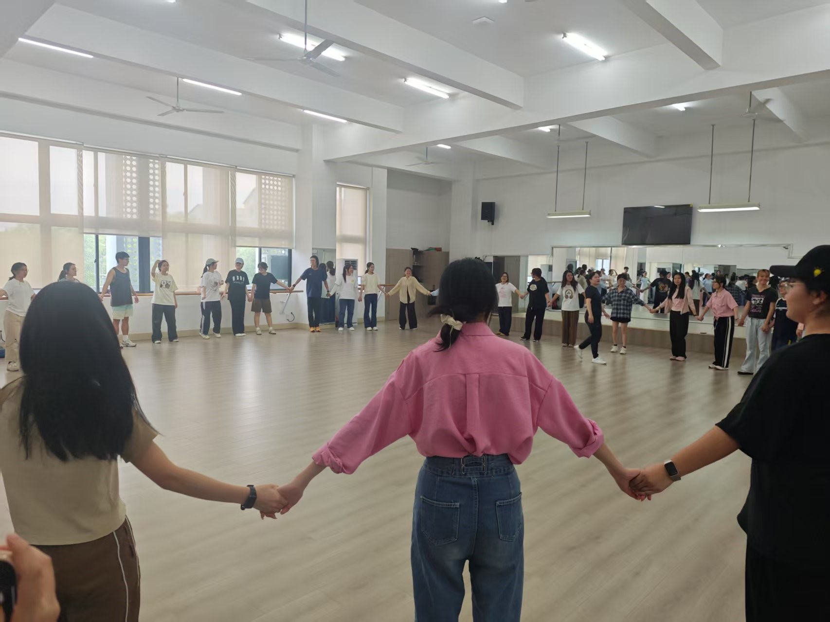 课堂上,老师先是站于队伍前方镜面示范整体动作,随音乐精准把握节拍旋转跳跃。同学们初始动作生疏、配合欠协调,但在导师鼓励指导下渐入佳境,动作熟练度与团队默契度同步提升。当小虎队《青苹果乐园》旋律响起,舞蹈教室气氛热烈。师生手拉手围成大圆,导师于圈侧轻盈示范舞步,与同学们同频舞动。阳光透过窗隙洒落,映照着一张张朝气脸庞。大家尽情舞动,抛却压力疲惫,沉浸式感受舞蹈快乐,生动展现拥抱健康、释放活力的青春风采。